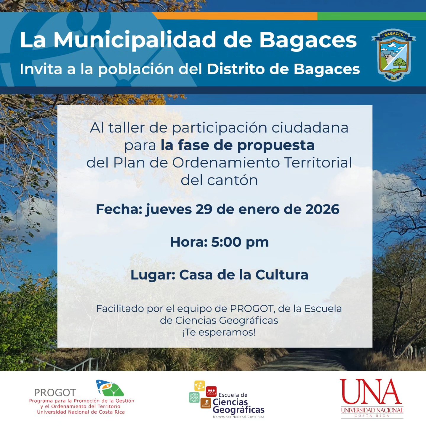 Queremos invitar a la comunidad de Bagaces al taller de participación ciudadana para la fase de propuesta del plan de Ordenamiento territorial del cantón
