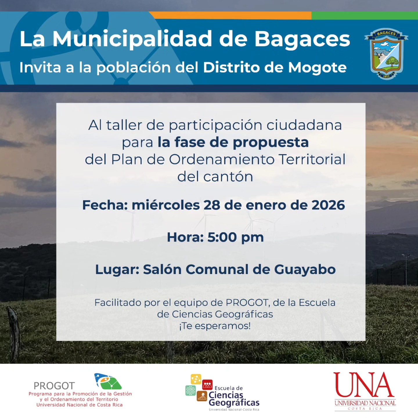 Queremos invitar a la comunidad de Mogote de Bagaces al taller de participación ciudadana para la fase de propuesta del plan de Ordenamiento territorial del cantón