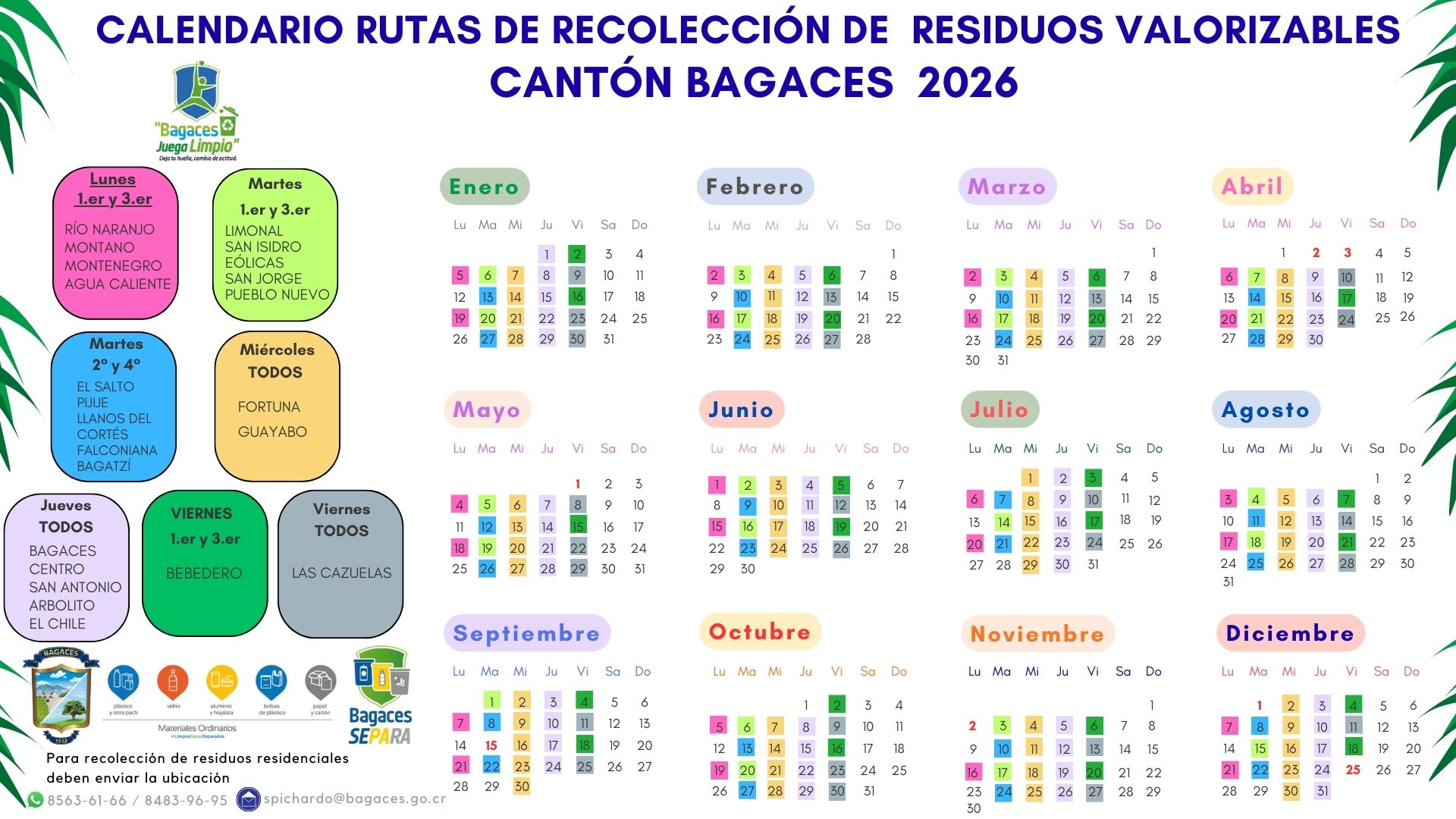 Compartimos el calendario anual de las rutas de recolección de residuos valorizables del cantón de Bagaces, con el fin de que puedan identificar los días correspondientes a cada comunidad y organizar adecuadamente la entrega de sus residuos.